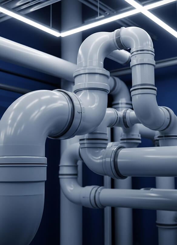 Le PVC (Polychlorure de Vinyle) est le thermoplastique le plus répandu dans l'industrie. Apprécié pour son excellent rapport qualité/prix, il est la référence pour les réseaux basse pression et les environnements chimiques standards.